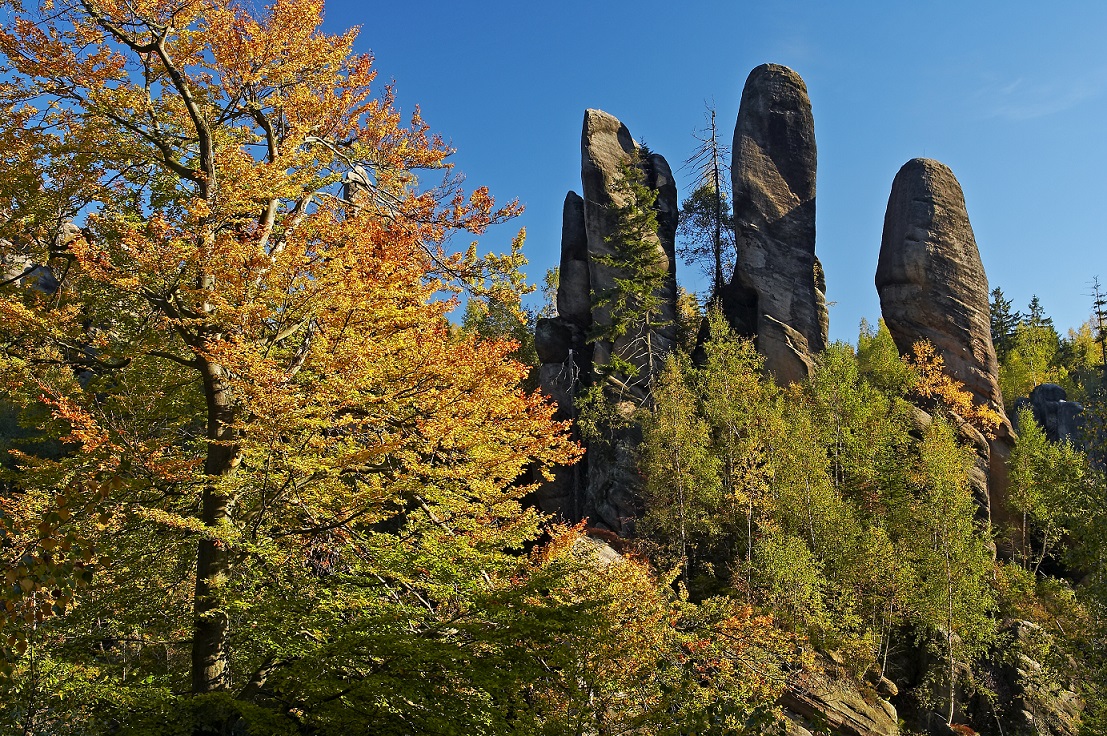 - Od vyhlídky se vydáme po hřebenu Broumovských stěn a dojdeme až ke kapli Panny Marie Sněžné. Cesta je lemována skalními útvary s přímo pohádkovými jmény jako je Bumbrlíček, Sova, Ležící mnich, Želva, Kočka nebo Mušle (1 km).