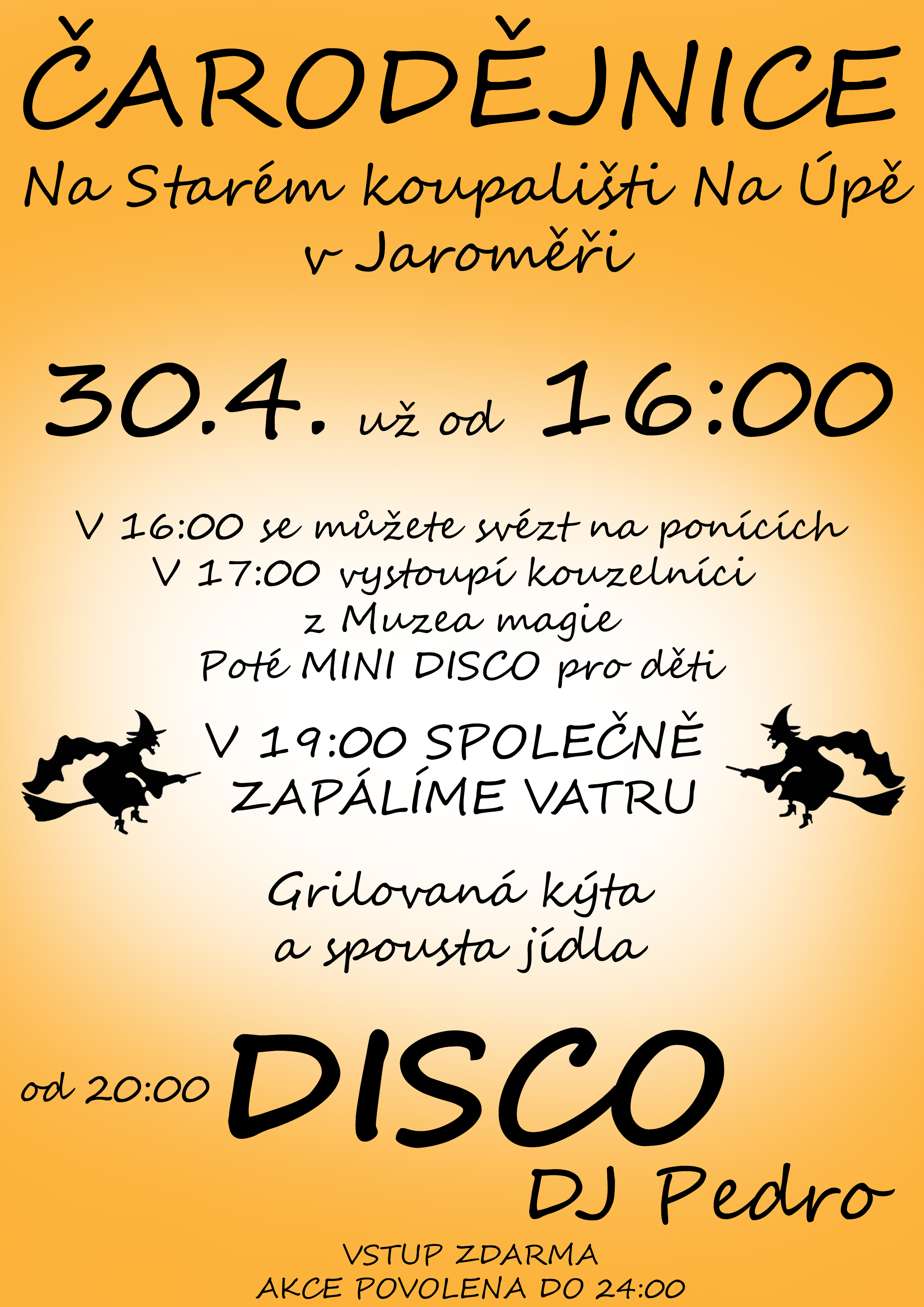 Přijďte oslavit Čarodějnice na Starém koupališti Na Úpě.