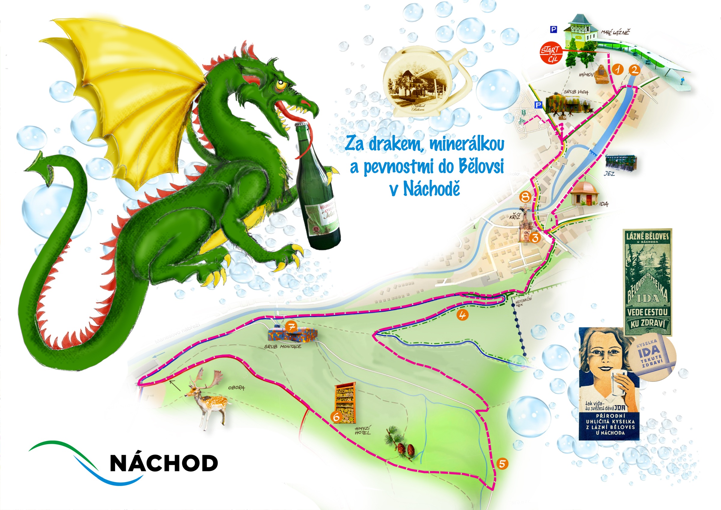 Trasa rozpoczyna się w Małym Spa w Náchodzie-Bělovsi, gdzie można skosztować lokalnej wody mineralnej Jan i Běla. Wzdłuż rzeki Metuji można dojść na teren Wielkiego Spa, skąd wypływa słynna woda mineralna Ida. Ścieżka zaprowadzi Państwa także do bunkrów piechoty, gdzie poznacie trochę historii tych obiektów.