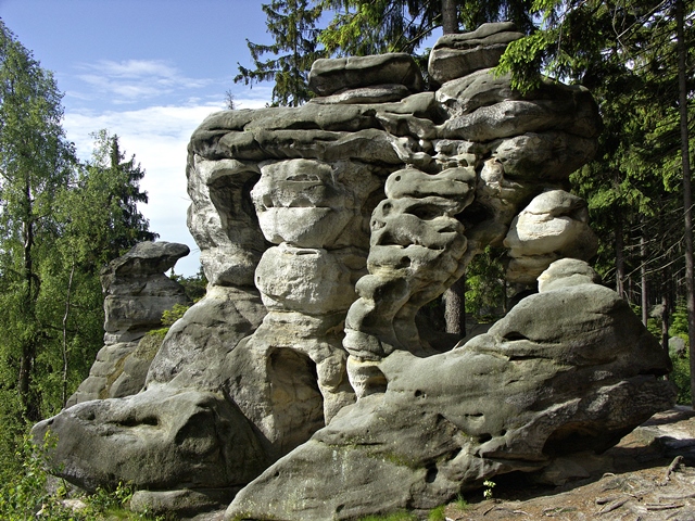 - Stołowa góra Ostasz - z parkingu kierujemy się w stronę Górnego Labiryntu. Zaraz na początku skalnego labiryntu powita nas tajemnicza formacja skalna o upiornej nazwie „Mogiła śmierci”, niedaleko od niej znajduje się druga skała o nazwie „Zdrajca”. Skała ta ma niewątpliwie ludzką postać i wiąże się z nią legenda z czasów, kiedy ludzie szukali schronienia na tych terenach przed żołnierzami śląskimi, ich prześladowcami. To tutaj najprawdopodobniej skamieniał zdrajca, który powiedział, gdzie ukrywają się uchodźcy. Niedaleko znajduje się skała „Samochód Diabła”, w którym odważni turyści mogą dojechać do punktów widokowych „Krticková” lub „Frýdlantská”, gdzie możemy cieszyć się wspaniałym widokiem na Dolny Labirynt, Skały Teplicko-Adršpašskie, Góry Jastrzębie, Ściany Broumowskie a podczas pięknej pogody także Karkonosze (2,4 km).